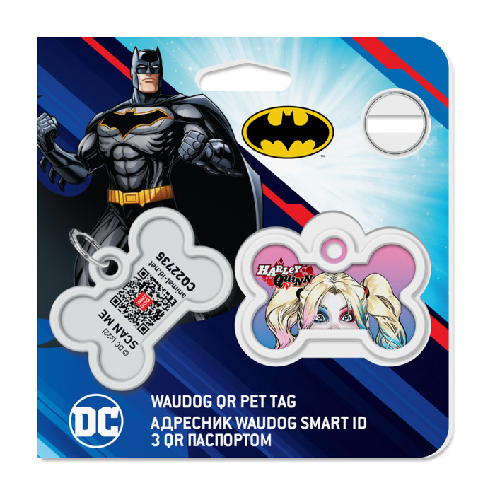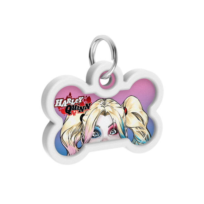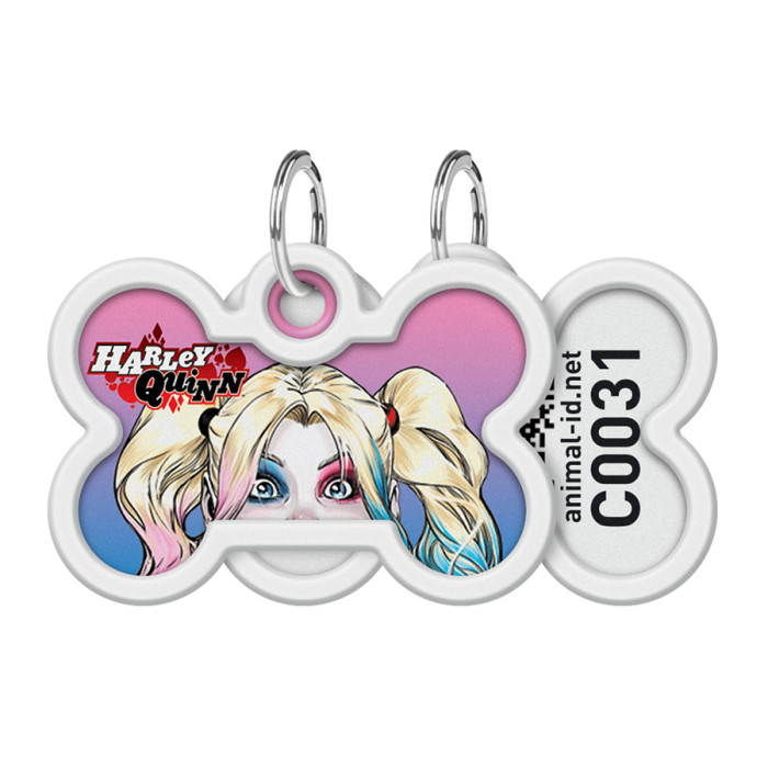 Адресник для собак і котів металевий WAUDOG Smart ID з QR паспортом, малюнок "Гарлі Квінн", кістка, Д 40 мм, Ш 28 мм