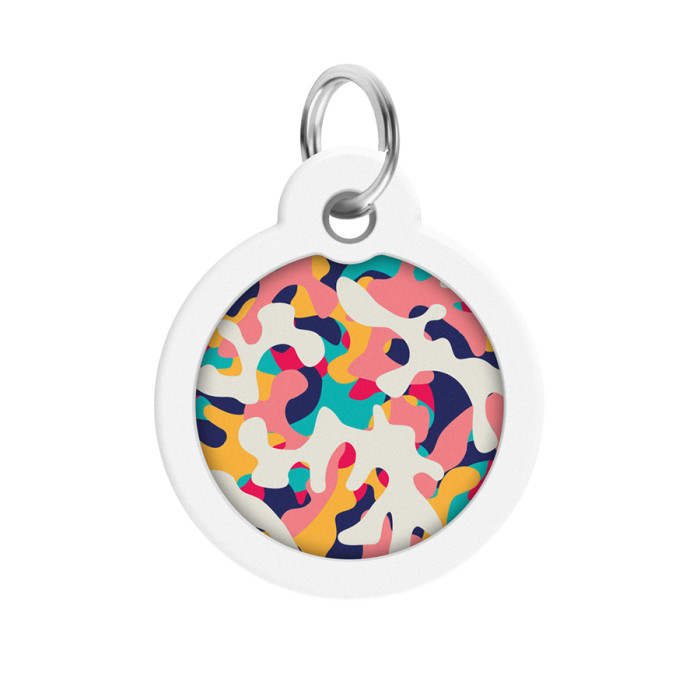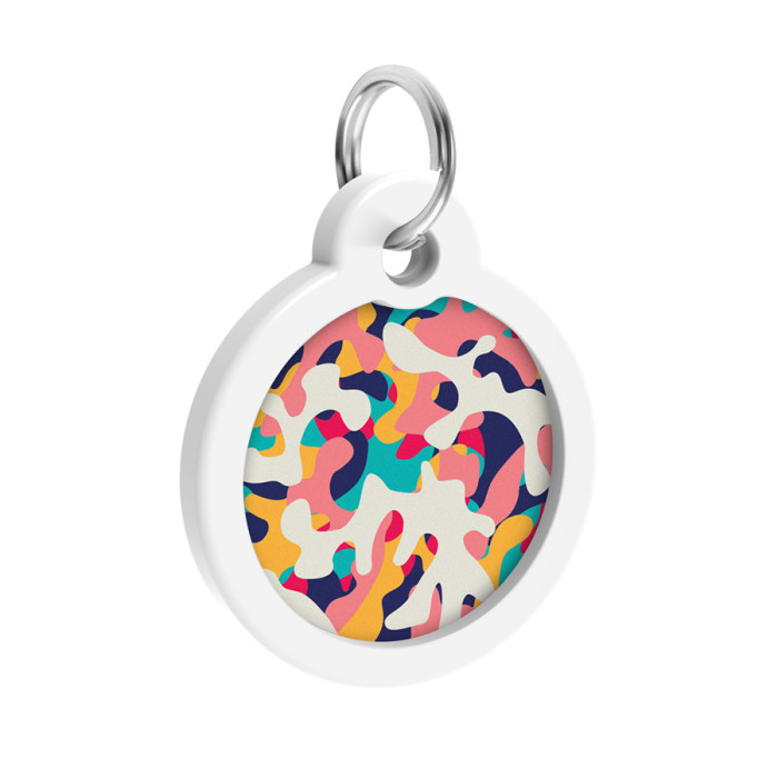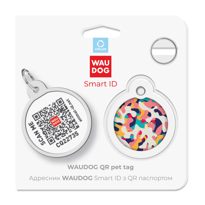 Адресник для собак і котів металевий WAUDOG Smart ID з QR паспортом, малюнок "Камо різнокольоровий", коло, Д 30 мм