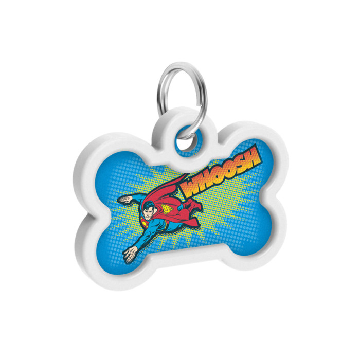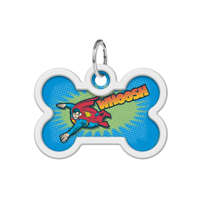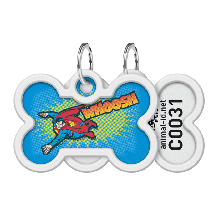 Адресник для собак і котів металевий WAUDOG Smart ID з QR паспортом, малюнок "Політ Супермена", кістка, Д 40 мм, Ш 28 мм