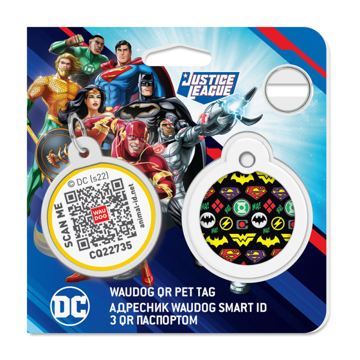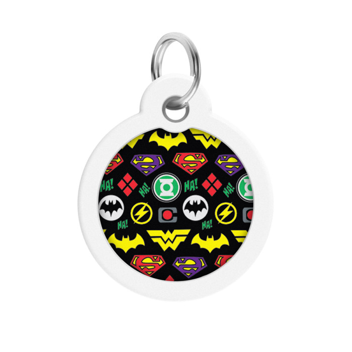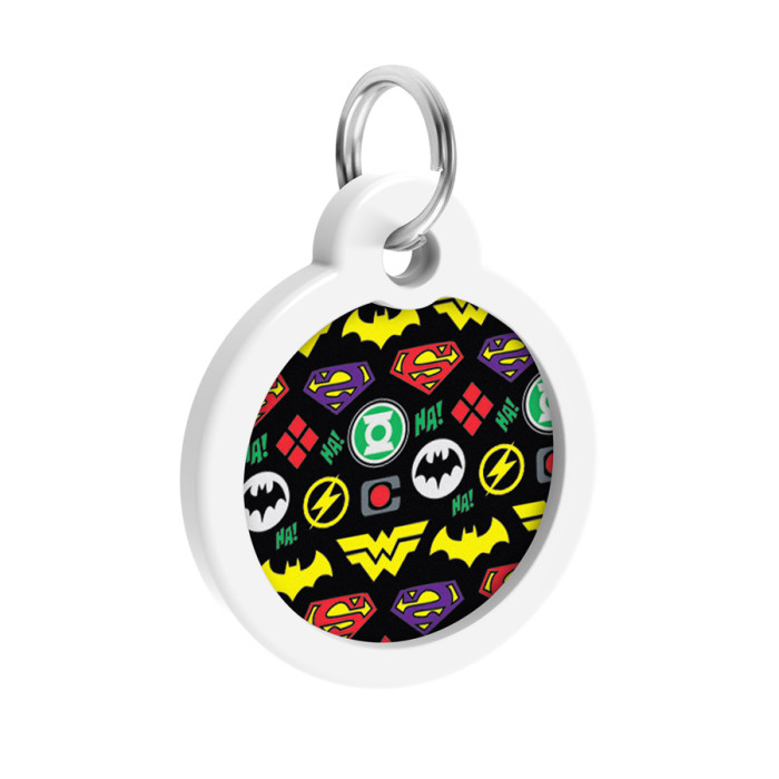 Адресник для собак і котів металевий WAUDOG Smart ID з QR паспортом, малюнок "Супергерої логоманія", коло, Д 30 мм
