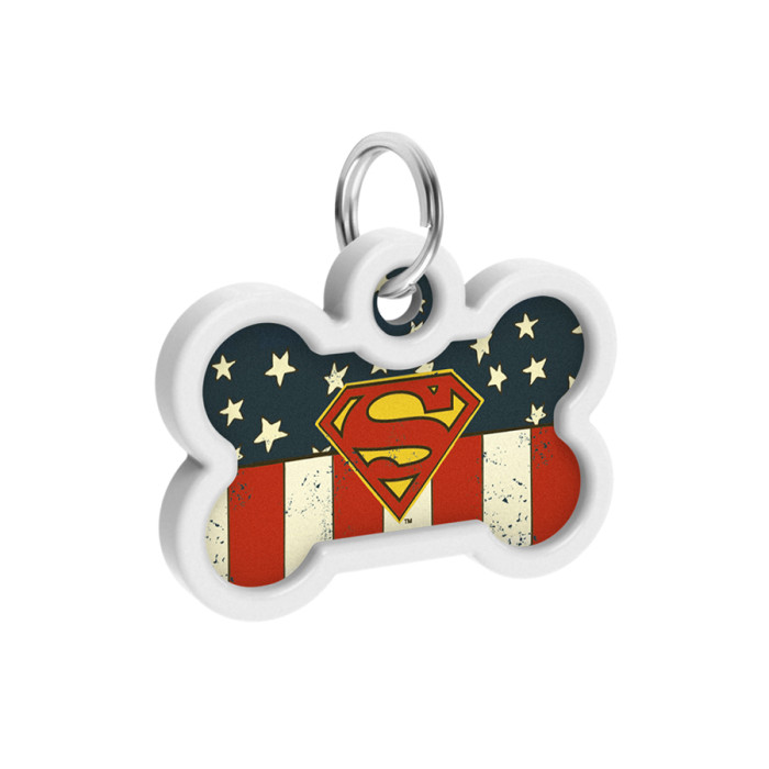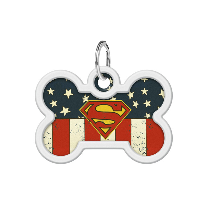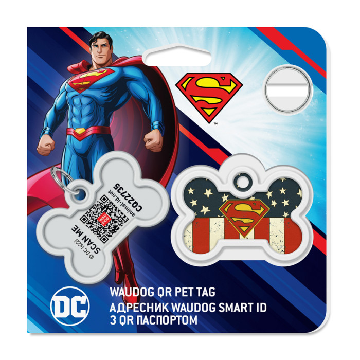Адресник для собак і котів металевий WAUDOG Smart ID з QR паспортом, малюнок "Супермен Америка", кістка, Д 40 мм, Ш 28 мм