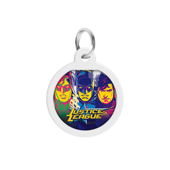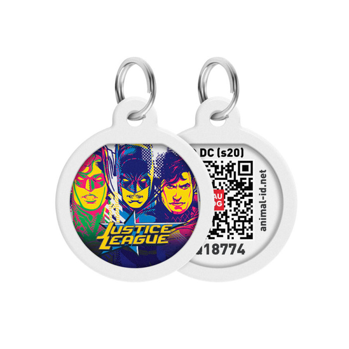 Адресник для собак та котів металічний WAUDOG Smart ID з QR паспортом, малюнок "Ліга Справедливості", круг, Д 25 мм