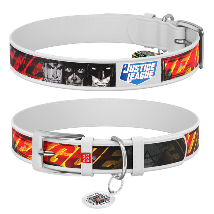 Нашийник для собак шкіряний WAUDOG Design з QR паспортом, малюнок "Ліга справедливості", Ш 20 мм, Дов 29-38 см білий
