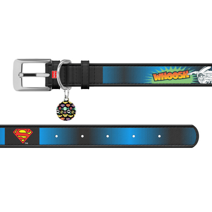 Серія WAUDOG Design доповнюється нашийниками з ліцензійним зображенням героїв фантастичного всесвіту DC Comics. Тепер культова символіка і популярні супергерої будуть красуватися на шкіряній амуніції WAUDOG Design. Завдяки яскравим і привабливим малюнкам ці вироби просто не зможуть залишитися непоміченими. Довжина нашийника підбирається відповідно до обхвату шиї хвостатого друга, який визначають вимірювальною стрічкою. При цьому правильно додавати до отриманого результату від 2 см (для середніх і дрібних порід) до 5 см (для великих), щоб нашийник не натирав і не здавлював шию тварини.