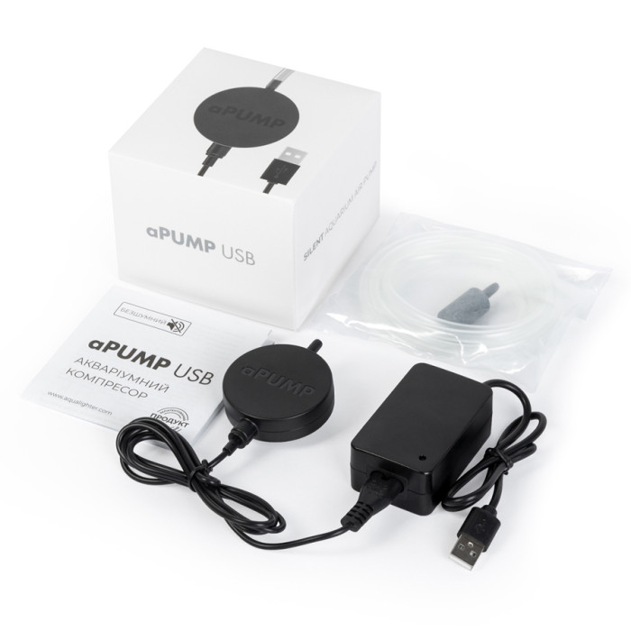 Акваріумний компресор aPUMP USB – продовження лінійки найтихіших та найменших акваріумних компресорів у світі. Він має зручний елемент живлення – USB кабель, що дає більшу варіативність у підключенні. Ви зможете розмістити улюблений акваріум де завгодно, не турбуючись, що обладнання буде видавати шум. Його діаметр становить всього 52 мм. Компресор створює достатній тиск повітряного потоку навіть для акваріумів з висотою водяного стовпа до 80 см. Компресор підходить для збагачення води киснем в акваріумах об'ємом до 100 літрів.Переваги:• Готовий комплект, який включає необхідні елементи для запуску: м'який силіконовий шланг (1,5 м) з розпилювачем, адаптер живлення та USB-кабель;• Легкість підключення завдяки використанню USB кабелю. Він дозволяє переміщати акваріум у зручне для вас місце та використовувати з будь-яким доступним блоком живлення 5 В через USB-вихід;• Час безперервної роботи від power bank (10000 мА-г): >25 год;• Пряма гарантія від виробника – 2 роки.