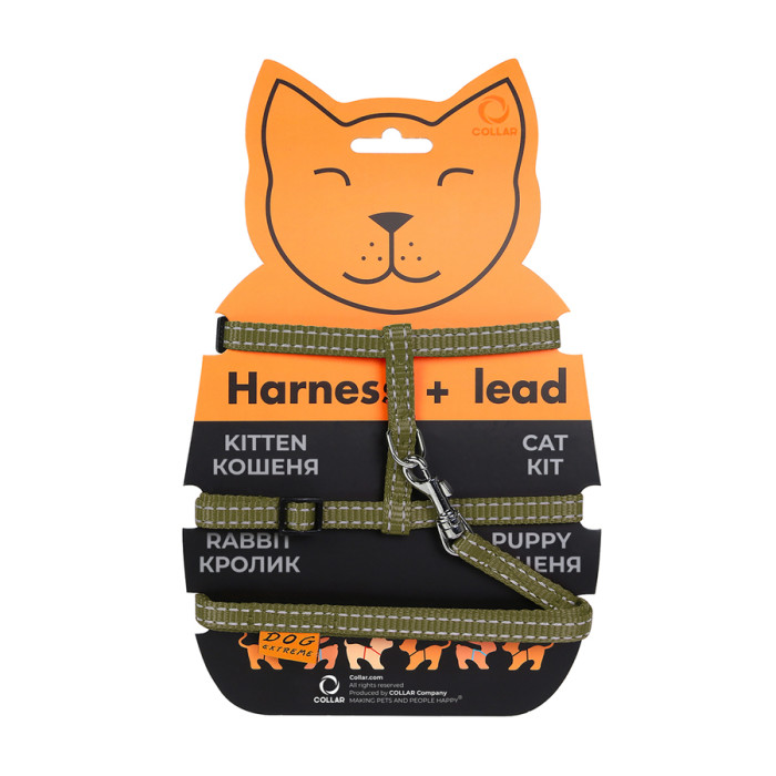 Шлея Dog Extreme з нейлону для котів з повідцем (ширина 10мм, А:20-30см, В:25-40см, довжина 110см) хакі