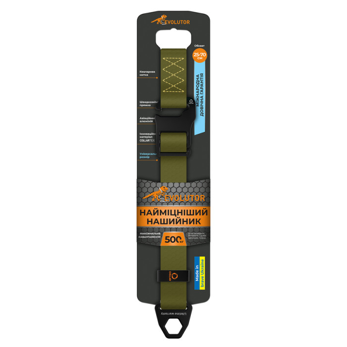 Амуніція EVOLUTOR — це інновація у кожній деталі! Стрічка виготовлена з комбінованого матеріалу COLLARTEX, який складається з внутрішнього армуючого шару, що несе на собі основне навантаження, і зовнішньої полімерної оболонки з унікальною, приємною на дотик, фактурою, що перешкоджає ковзанню. Попри безпрецедентну міцність, матеріал дуже легкий, що дозволяє значно знизити вагу амуніції та зробити її більш зручною у використанні. Для виключення слабких місць конструкції та збільшення терміну використання вироби прошиті кевларовою ниткою.Переваги:• Пряжка-гачок на нашийнику знімається та одягається одним рухом• На пряжці є місце для нанесення гравіювання• Внутрішній армуючий шар витримує навантаження 500 кг• Приємна на дотик оболонка не боїться води та легко миється