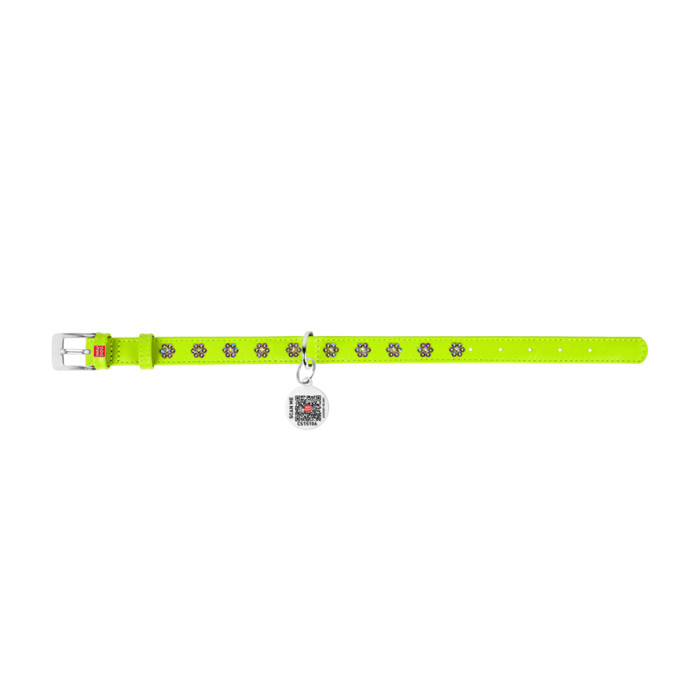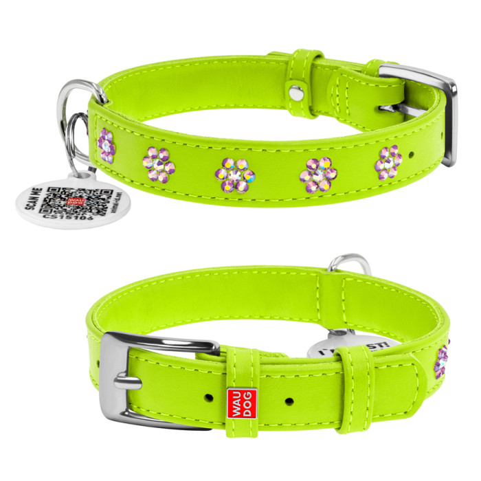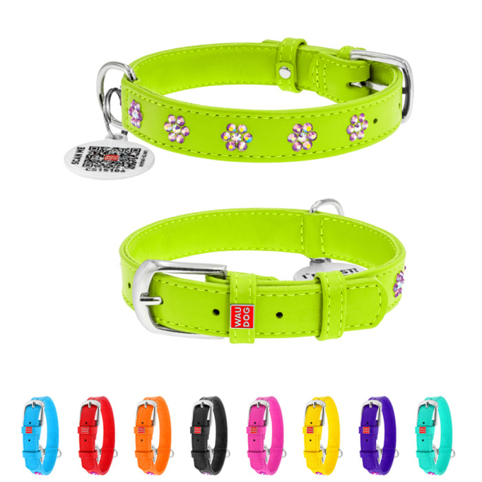 Нашийник для собак шкіряний WAUDOG Glamour з QR паспортом, з клейовими стразами "Квіти", Ш 20 мм, Дов 30-39 см