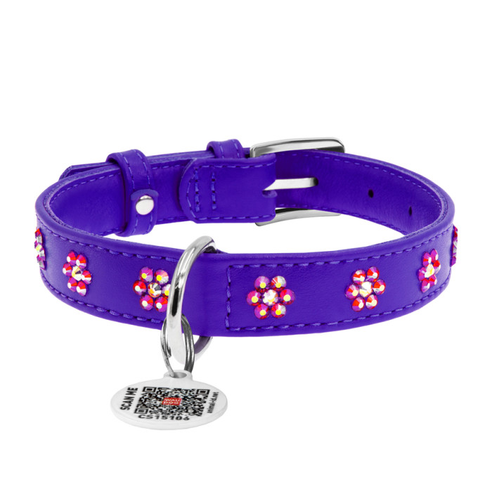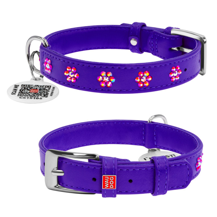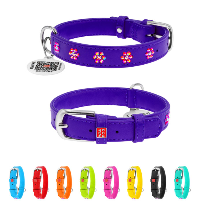Нашийник для собак шкіряний WAUDOG Glamour з QR паспортом, з клейовими стразами "Квіти", Ш 20 мм, Дов 30-39 см