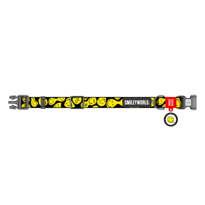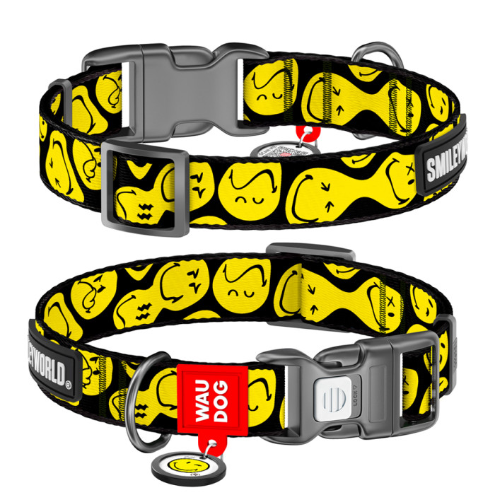 Нашийник для собак нейлоновий WAUDOG Nylon з QR-паспортом, малюнок "Смайли на чорному", пластиковий фастекс, М, Ш 20 мм, Дл 28-40 см