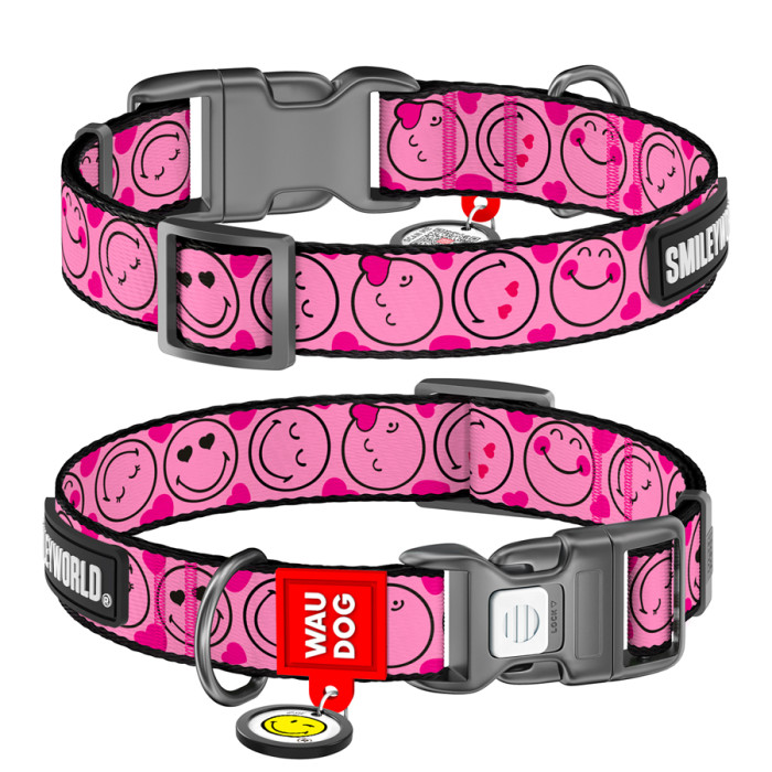 Нашийник для собак нейлоновий WAUDOG Nylon з QR-паспортом, малюнок "Смайли на рожевому", пластиковий фастекс, S, Ш 15 мм, Дл 25-35 см