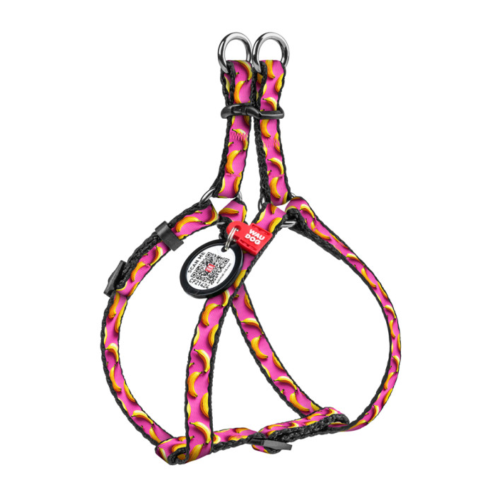 Шлея для котів та дрібних порід собак WAUDOG Nylon з QR паспортом, малюнок "Банани на рожевому", пластиковий фастекс, XS, Ш 10 мм, B=C 28-40 см