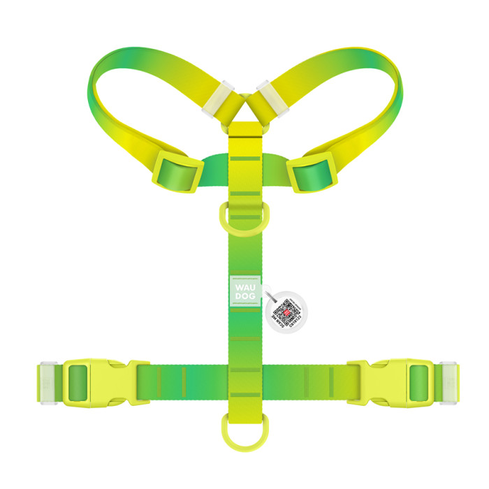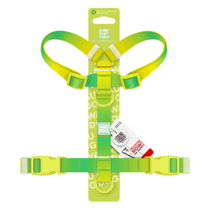Шлея для собак анатомічна H-подібна WAUDOG Nylon Recycled з QR-паспортом, градієнт, пластиковий фастекс, L, Ш 25 мм, А 51-85 см, В 60-85 см, салатовий