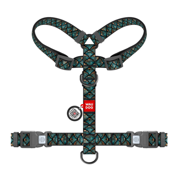Шлея для собак анатомічна H-подібна WAUDOG Nylon з QR адресником, малюнок "Луска", пластиковий фастекс, М, Ш 20 мм, А 38-60 см, В 46-60 см