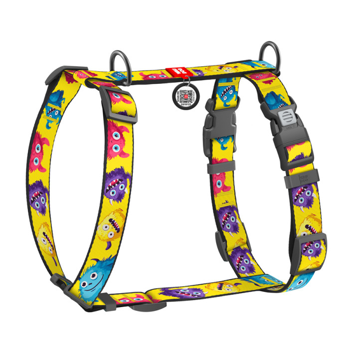 Шлея для собак анатомічна H-подібна WAUDOG Nylon з QR-паспортом, малюнок "Мохнаті монстри", пластиковий фастекс, M, Ш 20 мм, A 38-60 см, B 46-60 см