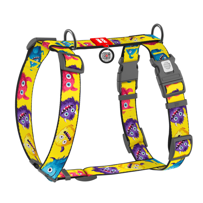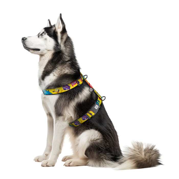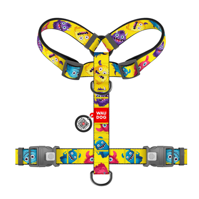 Шлея для собак анатомічна H-подібна WAUDOG Nylon з QR-паспортом, малюнок "Мохнаті монстри", пластиковий фастекс, XL, Ш 35 мм, A 60-100 см, B 70-100 см