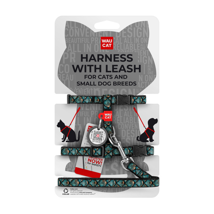 Шлея з повідцем для котів та дрібних порід собак WAUCAT Nylon з QR адресником, малюнок "Луска", пластиковий фастекс, XS, Ш 10 мм, В 25-40 см, С 20-30 см