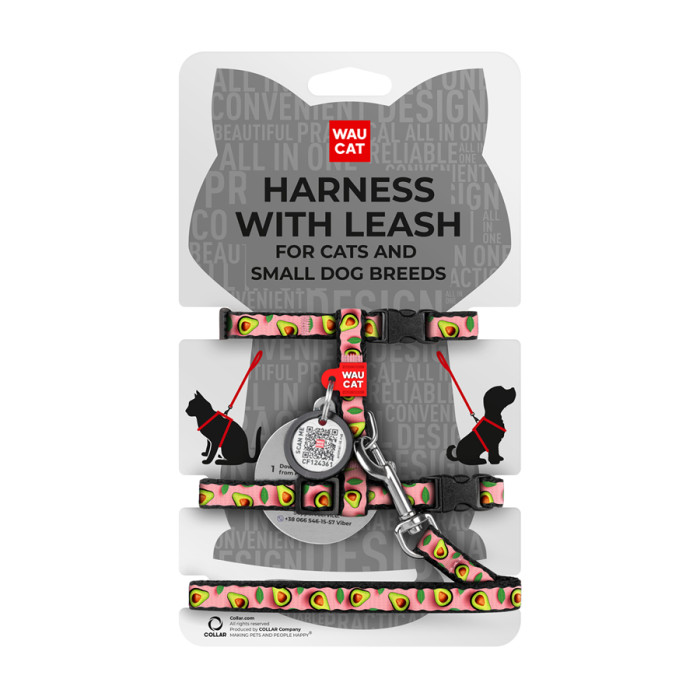 Шлея з повідцем для котів та дрібних порід собак WAUDOG Nylon з QR паспортом, малюнок "Авокадо на рожевому", пластиковий фастекс, XS, Ш 10 мм, В 25-40 см, С 20-30 см