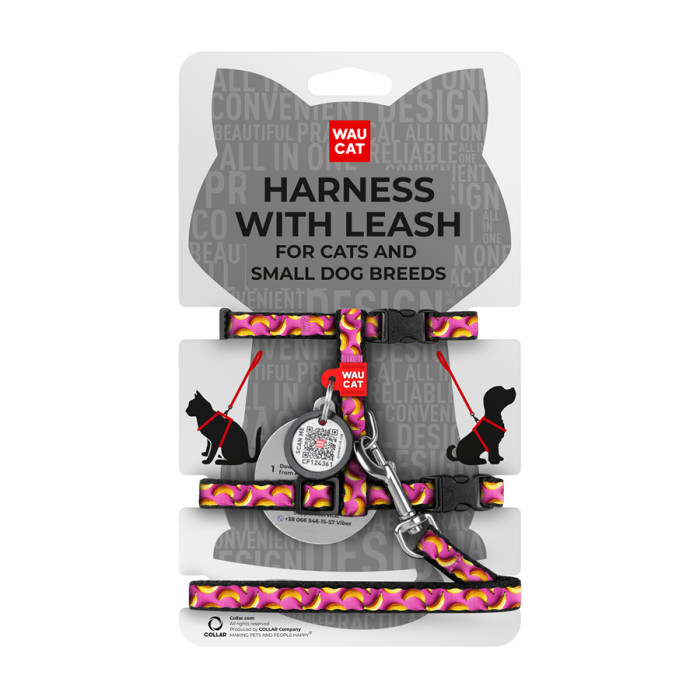 Шлея з повідцем для котів та дрібних порід собак WAUDOG Nylon з QR паспортом, малюнок "Банани на рожевому", пластиковий фастекс, XS, Ш 10 мм, В 25-40 см, С 20-30 см