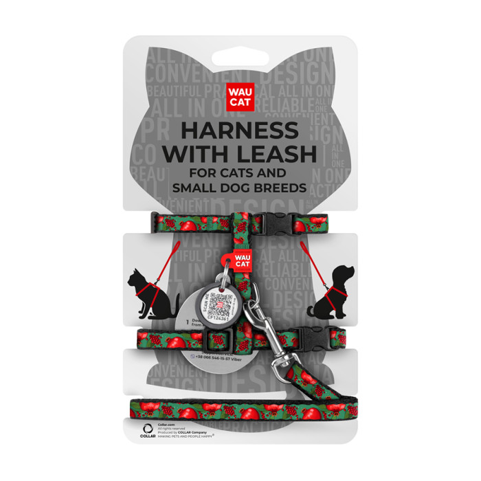 Шлея з повідцем для котів та дрібних порід собак WAUDOG Nylon з QR паспортом, малюнок "Гранати", пластиковий фастекс, XS, Ш 10 мм, В 25-40 см, С 20-30 см