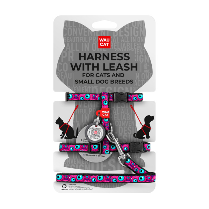 Шлея з повідцем для котів та дрібних порід собак WAUDOG Nylon з QR паспортом, малюнок "Око монстра", пластиковий фастекс, SX, Ш 10 мм, В 25-40 см, С 20-30 см