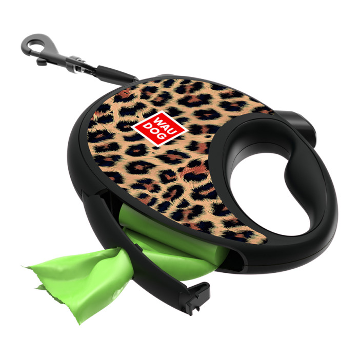 Повідець-рулетка для собак WAUDOG R-leash з контейнером для пакетів, малюнок "Леопард", світловідбивна стрічка, M, до 20 кг, 5 м