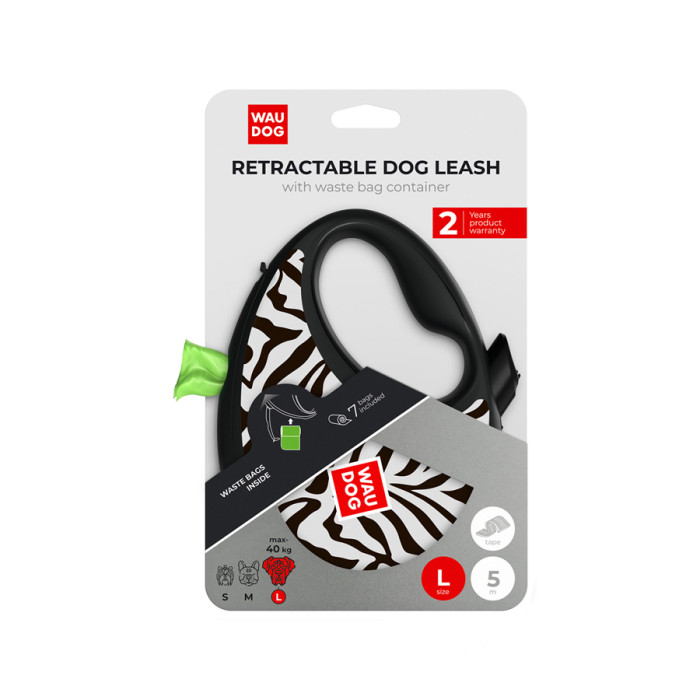 Повідець-рулетка для собак WAUDOG R-leash з контейнером для пакетів, малюнок "Зебра", світловідбивна стрічка, L, до 40 кг, 5 м