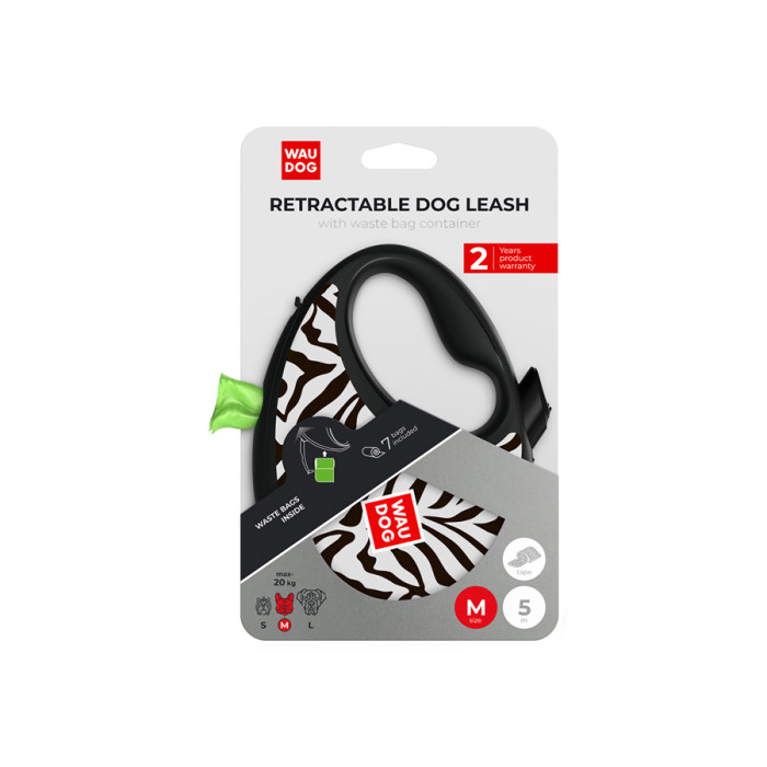 Повідець-рулетка для собак WAUDOG R-leash з контейнером для пакетів, малюнок "Зебра", світловідбивна стрічка, M, до 20 кг, 5 м