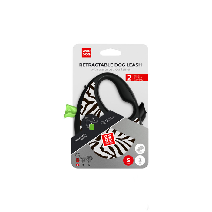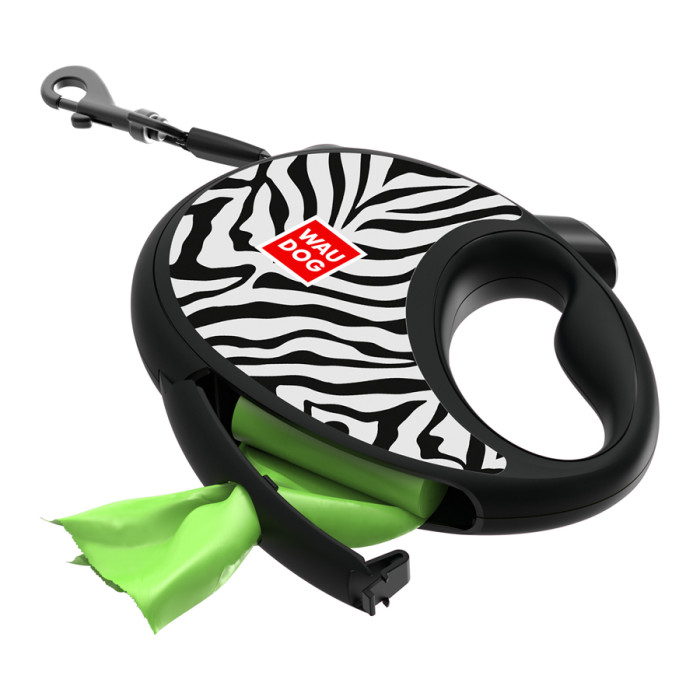 Повідець-рулетка для собак WAUDOG R-leash з контейнером для пакетів, малюнок "Зебра", світловідбивна стрічка, S, до 12 кг, 3 м