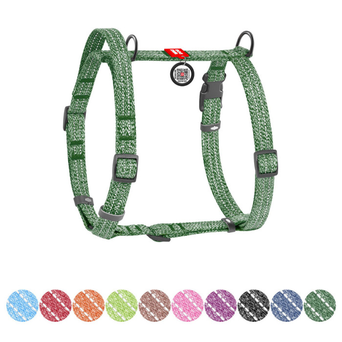 Шлея виготовлена з відновленої бавовни, що робить її екологічно чистою та зносостійкою. Гіпоалергенний матеріал забезпечує комфорт для пухнастого улюбленця, а вплетена світловідбивна нитка гарантує безпеку під час прогулянок у темний час доби. Шлея розроблена таким чином, що при натягу повідця не відбувається стискання дихальних шляхів тварини. Має 2 півкільця для повідця (верхнє та нижнє), що дозволяє більш рівномірно розподілити фізичне навантаження на опорно-руховий апарат собаки.Переваги:•Анатомічна конструкція;• Екологічний та гіпоалергенний матеріал;• Довічна гарантія на фурнітуру;• Наявність адресника з QR-паспортом• Світловідбивні елементи