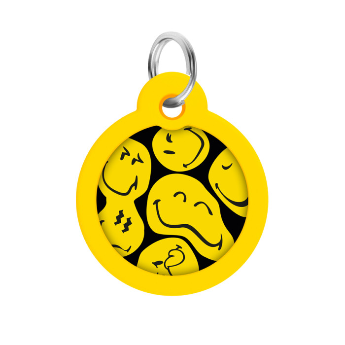 Адресник для собак і котів металевий WAUDOG Smart ID з QR паспортом, малюнок "Смайли на чорному", коло, Д 30 мм