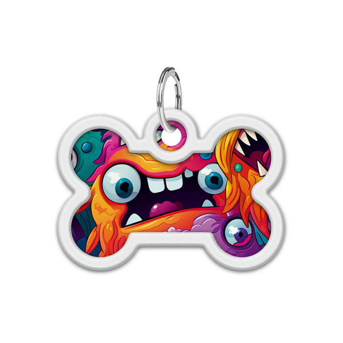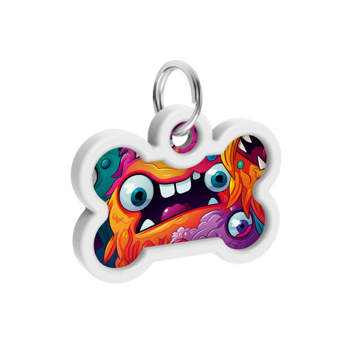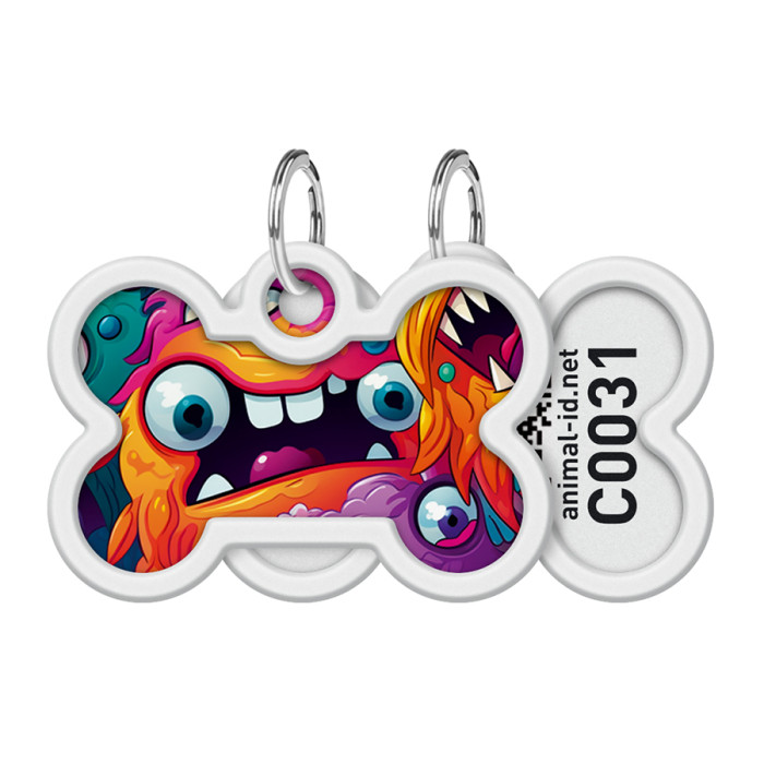 Адресник для собак і котів металевий WAUDOG Smart ID з QR паспортом, малюнок "Зубасті монстри", кістка, Д 40 мм, Ш 28 мм