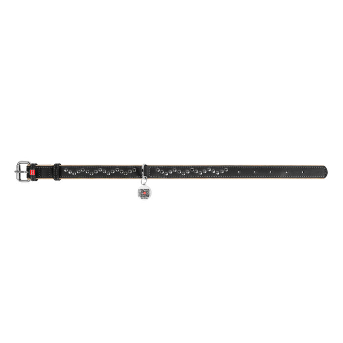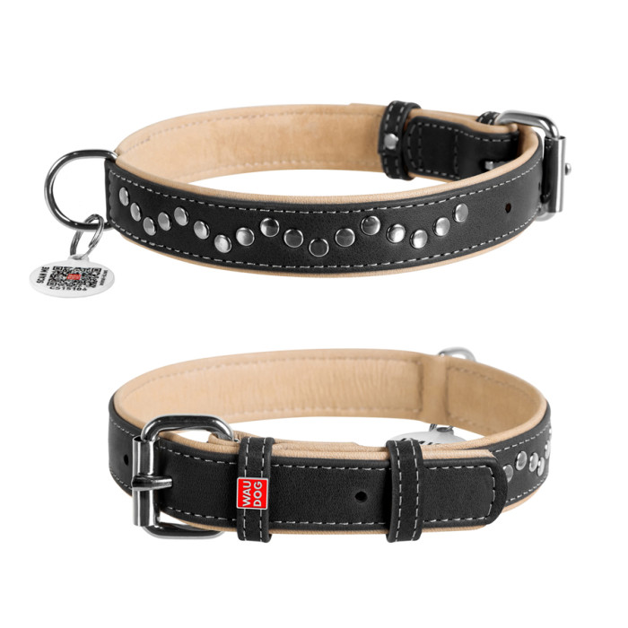 Нашийник для собак шкіряний WAUDOG Soft з QR паспортом, металічні прикраси, Ш 25 мм, Дов 38-49 см чорний