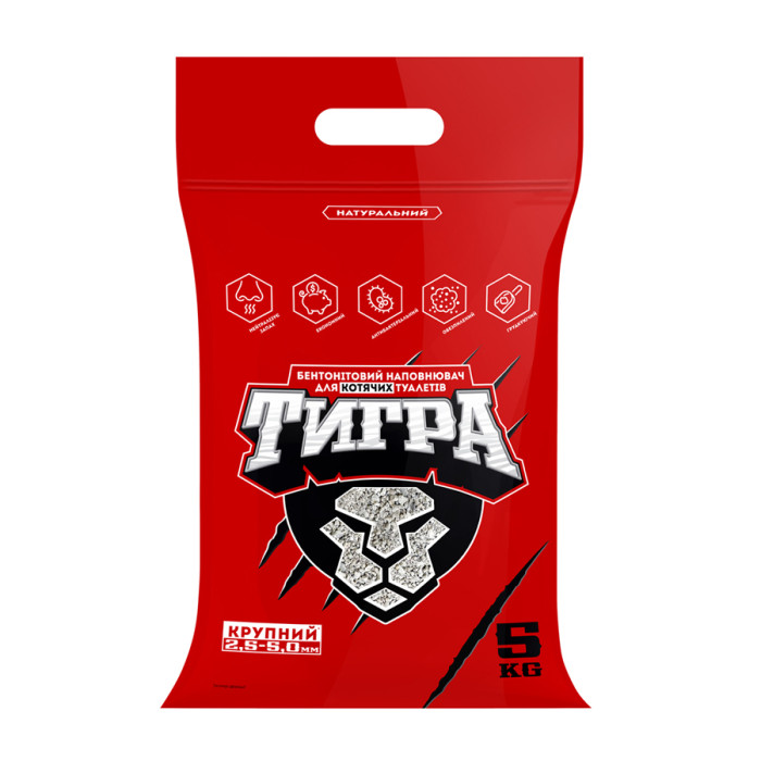 "ТИГРА" - це 100% натуральний наповнювач для котячого туалету, що комкується. Створений з бентонітових глин, що пройшли очищення та спеціальну обробку. Переваги:- гранули наповнювача миттєво поглинають вологу, утворюючи грудки - це дозволяє прибирати лише використану сировину;- має високі абсорбуючі властивості;- надійно нейтралізує неприємні запахи, що допомагає підтримувати атмосферу чистоти в будинку;- грануликрупного розміру 2,5-5 мм чудово підходять котам;- швидке поглинання вологи перешкоджає розмноженню бактерій та появі неприємного запаху з котячого туалету.Правила використання: візьміть чистий і сухий лоток і заповніть його шаром наповнювача 4-5 см. Чистити котячий туалет необхідно після кожного відвідування його кішкою, прибираючи лише грудки, що утворилися. Після збирання додайте необхідну кількість свіжого наповнювача. Викидайте використаний наповнювач із побутовими відходами або в контейнер із біосміттям. Не рекомендується викидати використаний наповнювач у каналізаційні системи.