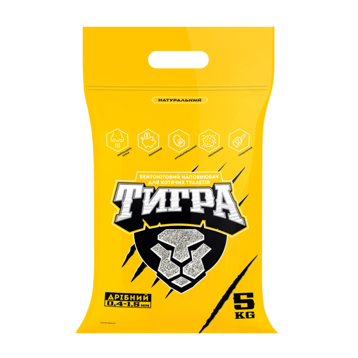 "ТИГРА" - це 100% натуральний наповнювач для котячого туалету, що комкується. Створений з бентонітових глин, що пройшли очищення та спеціальну обробку. Переваги:- гранули наповнювача миттєво поглинають вологу, утворюючи грудки - це дозволяє прибирати лише використану сировину;- має високі абсорбуючі властивості;- надійно нейтралізує неприємні запахи, що допомагає підтримувати атмосферу чистоти в будинку;- завдяки дрібній гранули (0,4-1,5 мм) наповнювач можна використовувати для кошенят;- швидке поглинання вологи перешкоджає розмноженню бактерій та появі неприємного запаху з котячого туалету.Правила використання: візьміть чистий і сухий лоток і заповніть його шаром наповнювача 4-5 см. Чистити котячий туалет необхідно після кожного відвідування його кішкою, прибираючи лише грудки, що утворилися. Після збирання додайте необхідну кількість свіжого наповнювача. Викидайте використаний наповнювач із побутовими відходами або в контейнер із біосміттям. Не рекомендується викидати використаний наповнювач у каналізаційні системи.