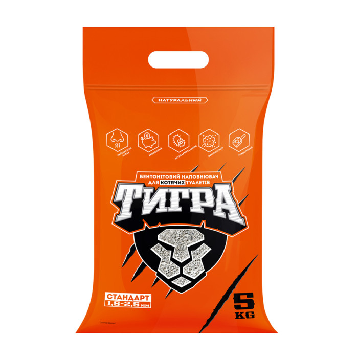 "ТИГРА" - це 100% натуральний наповнювач для котячого туалету, що комкується. Створений з бентонітових глин, що пройшли очищення та спеціальну обробку. Переваги:- гранули наповнювача миттєво поглинають вологу, утворюючи грудки - це дозволяє прибирати лише використану сировину;- має високі абсорбуючі властивості;- надійно нейтралізує неприємні запахи, що допомагає підтримувати атмосферу чистоти в будинку;- гранули середнього розміру 1,5-2,5 мм чудово підходять котам;- швидке поглинання вологи перешкоджає розмноженню бактерій та появі неприємного запаху з котячого туалету.Правила використання: візьміть чистий і сухий лоток і заповніть його шаром наповнювача 4-5 см. Чистити котячий туалет необхідно після кожного відвідування його кішкою, прибираючи лише грудки, що утворилися. Після збирання додайте необхідну кількість свіжого наповнювача. Викидайте використаний наповнювач із побутовими відходами або в контейнер із біосміттям. Не рекомендується викидати використаний наповнювач у каналізаційні системи.