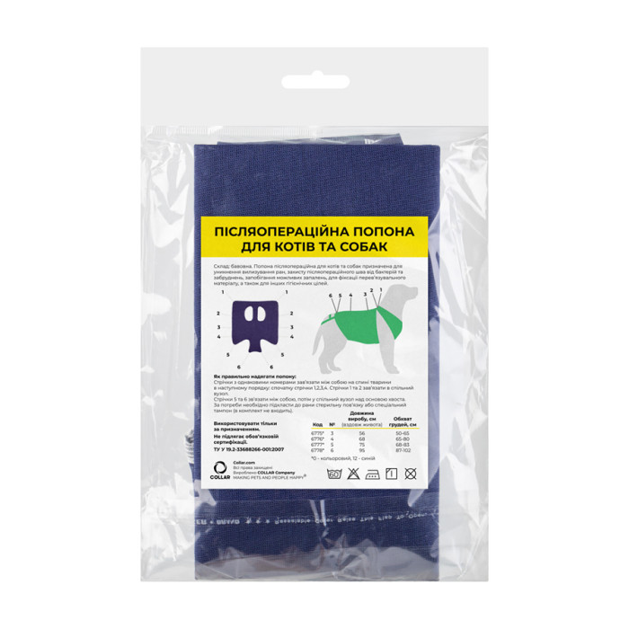 Післяопераційна попона призначена для захисту тіла тварини після медичних операцій, для фіксації на тварині перев'язувального матеріалу, а також для інших гігієнічних цілей.