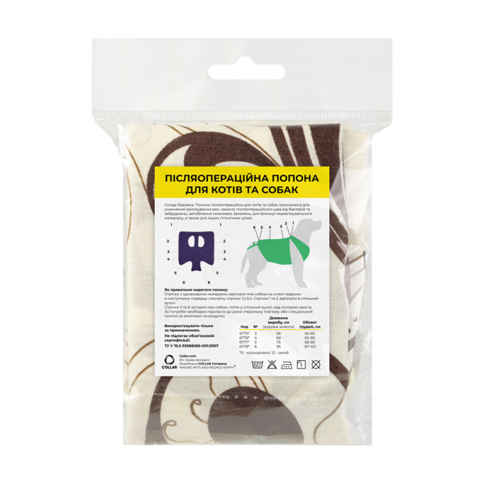 Післяопераційна попона призначена для захисту тіла тварини після медичних операцій, для фіксації на тварині перев'язувального матеріалу, а також для інших гігієнічних цілей.