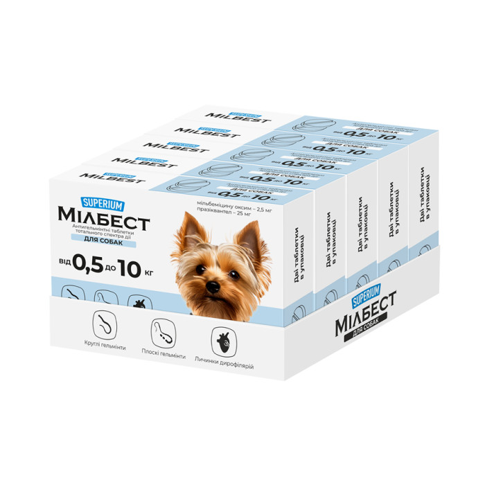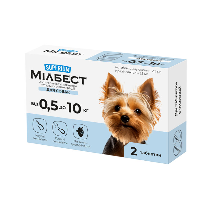СУПЕРІУМ Мілбест антигельмінтні таблетки для собак. Тотальне знищення всіх видів гельмінтів. Препарат призначений для лікування та профілактики дорослих собак та цуценят при ураженні цестодами, нематодами, трематодами та при змішаних зараженнях. Профілактика дирофіляріозу. 30 діб захисту. Для профілактики достатньо прийому раз на 3 місяці. 2 таблетки в упаковці. Діючі речовини: мільбеміцину оксим, празіквантел. Переваги: - Тотальне знищення всіх видів гельмінтів - Безпечно для цуценят віком від 2 тижнів - Профілактика очних, легеневих і серцевих гельмінтів