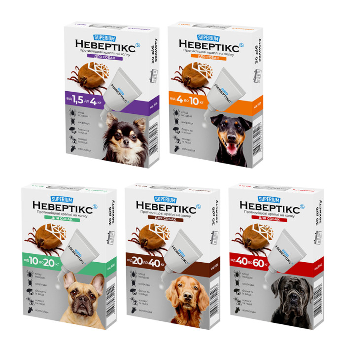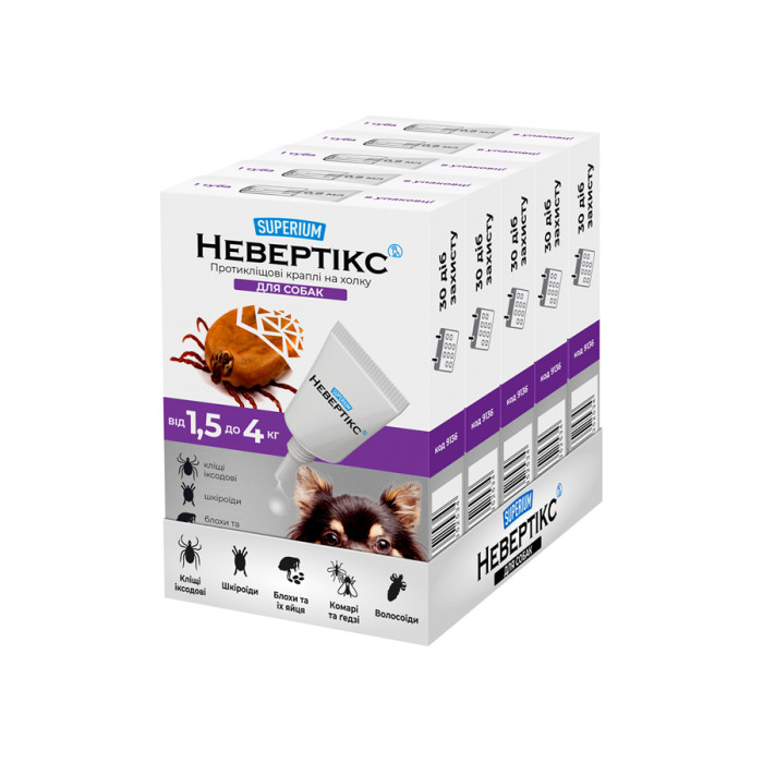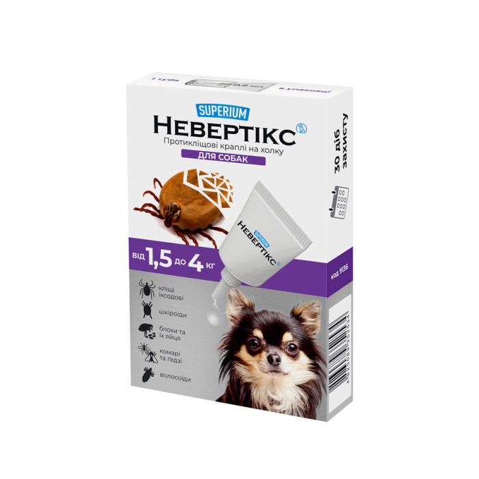 СУПЕРІУМ Невертікс – протикліщові краплі для собак вагою 1,5-4 кг. Комплексний захист від усіх видів кліщів, бліх та комах протягом 1 місяця.Склад (1 мл): перметрин – 25 %, імідаклоприд – 5 %, пірипроксифен – 0,3%.Призначення:– лікування та профілактика при ураженні кліщами усіх видів, в тому числі іксодовими, блохами, вошами, волосоїдами;– відлякування комах – комарів, ґедзів, мошок, мокреців, москітів та зоофільних мух;– профілактика блошиного алергічного дерматиту.Препарат застосовують зовнішньо шляхом одноразового нанесення на суху непошкоджену шкіру в місцях, що недоступні для злизування (ділянка холки та вздовж хребта).