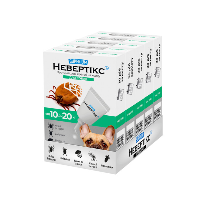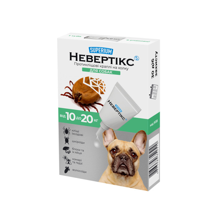 СУПЕРІУМ Невертікс – протикліщові краплі для собак вагою 10-20 кг. Комплексний захист від усіх видів кліщів, бліх та комах протягом 1 місяця.Склад (1 мл): перметрин – 25 %, імідаклоприд – 5 %, пірипроксифен – 0,3%.Призначення:– лікування та профілактика при ураженні кліщами усіх видів, в тому числі іксодовими, блохами, вошами, волосоїдами;– відлякування комах – комарів, ґедзів, мошок, мокреців, москітів та зоофільних мух;– профілактика блошиного алергічного дерматиту.Препарат застосовують зовнішньо шляхом одноразового нанесення на суху непошкоджену шкіру в місцях, що недоступні для злизування (ділянка холки та вздовж хребта).