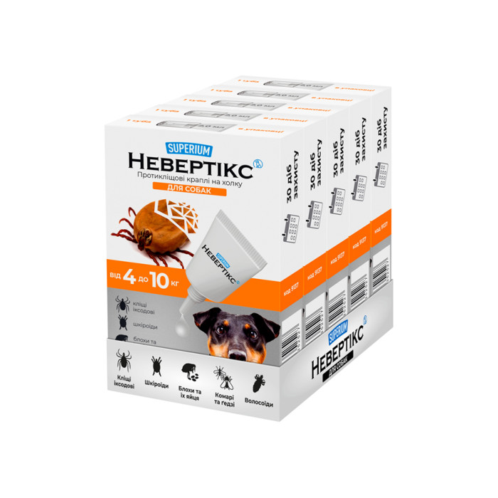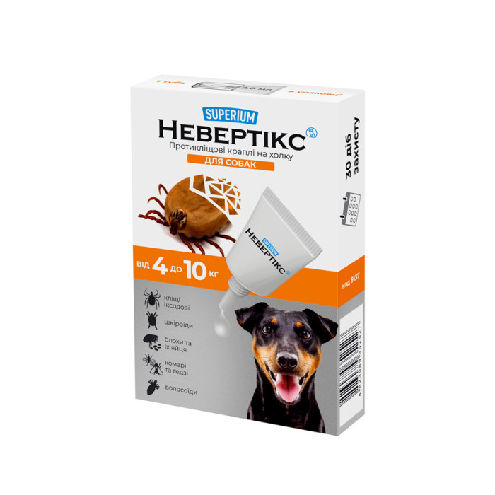СУПЕРІУМ Невертікс – протикліщові краплі для собак вагою 4-10 кг. Комплексний захист від усіх видів кліщів, бліх та комах протягом 1 місяця.Склад (1 мл): перметрин – 25 %, імідаклоприд – 5 %, пірипроксифен – 0,3%.Призначення:– лікування та профілактика при ураженні кліщами усіх видів, в тому числі іксодовими, блохами, вошами, волосоїдами;– відлякування комах – комарів, ґедзів, мошок, мокреців, москітів та зоофільних мух;– профілактика блошиного алергічного дерматиту.Препарат застосовують зовнішньо шляхом одноразового нанесення на суху непошкоджену шкіру в місцях, що недоступні для злизування (ділянка холки та вздовж хребта).