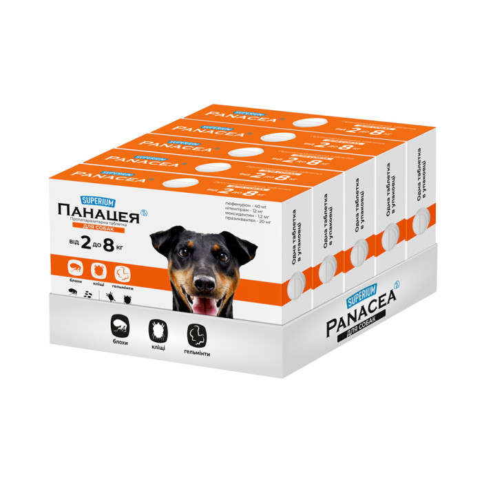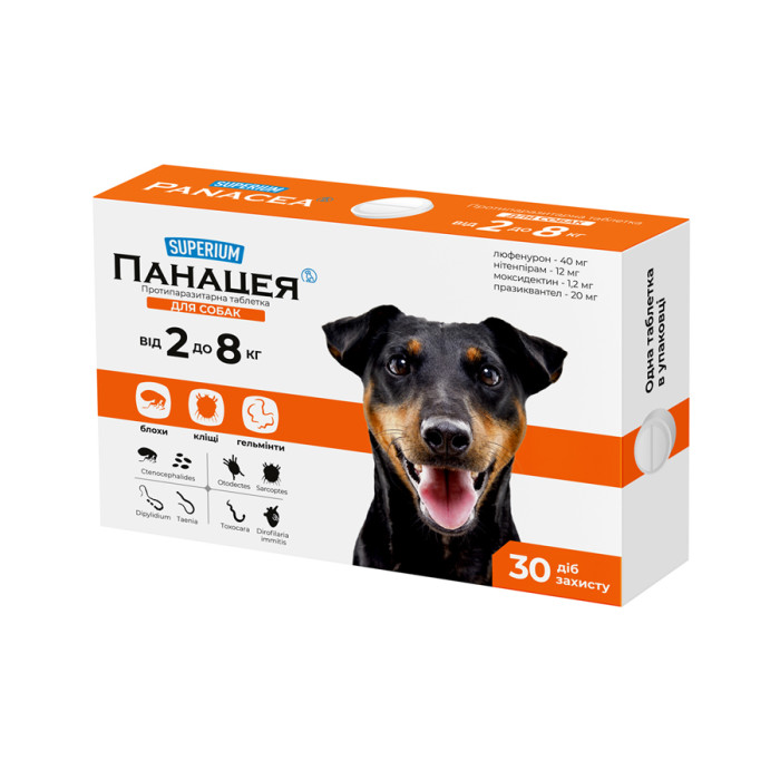 СУПЕРІУМ Панацея протипаразитарна таблетка для собак вагою від 2 до 8 кг. Захист від 29 видів паразитів. Препарат призначений для лікування та профілактики дорослих собак та цуценят при ураженні ектопаразитами: блохами, вошами, волосоїдами, вушним та підшкірним кліщами; ендопаразитами: нематодами шлунково-кишкового тракту та цестодами. Профілактика блошиного дерматиту та дирофіляріозу. 30 діб захисту. Діючі речовини (унікальна комбінація): люфенурон, нітенпірам, моксидектин, празіквантел. Переваги: - Найкраща формула захисту в осінньо-зимовий період. - Широкий спектр дії - захист від кліщів, бліх, гельмінтів.- Профілактика блошиного дерматиту та дирофіляріозу (серцеві гельмінти).