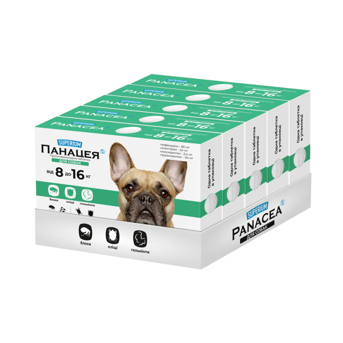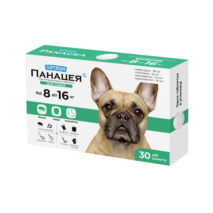 СУПЕРІУМ Панацея протипаразитарна таблетка для собак вагою від 8 до 16 кг. Захист від 29 видів паразитів. Препарат призначений для лікування та профілактики дорослих собак та цуценят при ураженні ектопаразитами: блохами, вошами, волосоїдами, вушним та підшкірним кліщами; ендопаразитами: нематодами шлунково-кишкового тракту та цестодами. Профілактика блошиного дерматиту та дирофіляріозу. 30 діб захисту. Діючі речовини (унікальна комбінація): люфенурон, нітенпірам, моксидектин, празіквантел. Переваги: - Найкраща формула захисту в осінньо-зимовий період. - Широкий спектр дії - захист від кліщів, бліх, гельмінтів.- Профілактика блошиного дерматиту та дирофіляріозу (серцеві гельмінти).