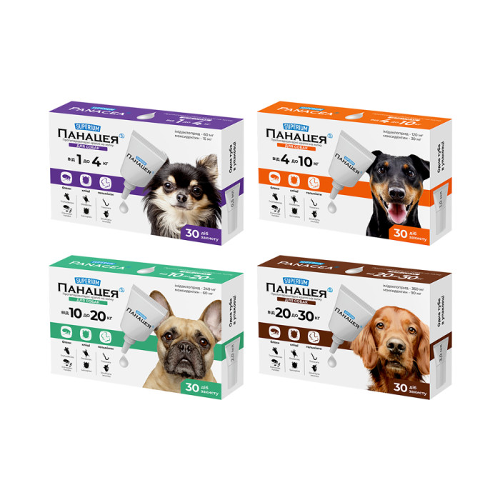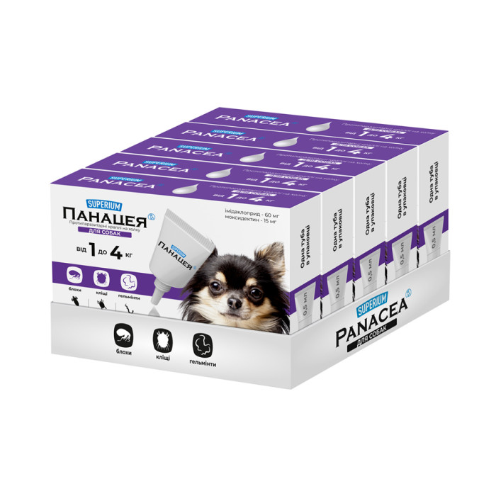 СУПЕРІУМ Панацея протипаразитарні краплі для собак від 1 до 4 кг.Захист від 26 видів паразитів.Препарат ефективний для лікування та профілактики при ураженні вушним та підшкірними кліщами, блохами та їх личинками, вошами, волосоїдами, гельмінтами (нематодами). 30 діб захисту.Діючі речовини: імідаклоприд, моксидектин. Переваги: - Найкраща формула захисту в осінньо-зимовий період. - Широкий спектр дії - захист від кліщів, бліх, гельмінтів (нематод). - Профілактика блошиного дерматиту та дирофіляріозу (серцеві гельмінти).