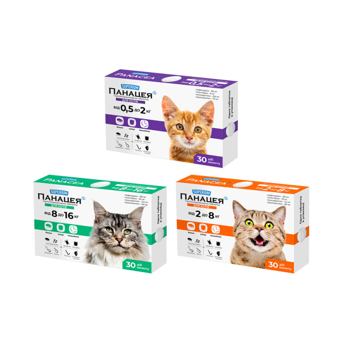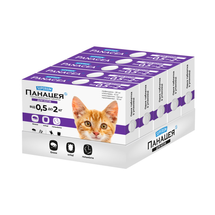 СУПЕРІУМ Панацея — інноваційна протипаразитарна таблетка для котів вагою від 0,5 кг до 2 кг. Склад (100 мг): люфенурон 10 мг, нітерпірам - 3 мг, моксидектин - 0,3 мг, празиквантел - 5 мг. Застосування:- профілактика і лікування при ураженні усіми видами котячих паразитів - блохами, кліщами, шкіроїдами, вошами, волосоїдами, гельмінтами (нематодами і цестодами травного каналу);- профілактика блошиного алергічного дерматиту;- профілактика дирофіляріозу (серцеві гельмінти).Таблетка приймається самостійно або розкришується в їжу. Дія таблетки проявляється вже через 24 години. За допомогою сорбентів складі таблетки, вона швидко виводить токсини з організму.