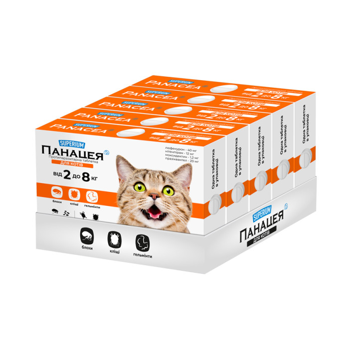 СУПЕРІУМ Панацея — інноваційна протипаразитарна таблетка для котів вагою від 2 кг до 8 кг. Склад (100 мг): люфенурон 10 мг, нітерпірам - 3 мг, моксидектин - 0,3 мг, празиквантел - 5 мг. Застосування:- профілактика і лікування при ураженні усіми видами котячих паразитів - блохами, кліщами, шкіроїдами, вошами, волосоїдами, гельмінтами (нематодами і цестодами травного каналу);- профілактика блошиного алергічного дерматиту;- профілактика дирофіляріозу (серцеві гельмінти).Таблетка приймається самостійно або розкришується в їжу. Дія таблетки проявляється вже через 24 години. За допомогою сорбентів складі таблетки, вона швидко виводить токсини з організму.