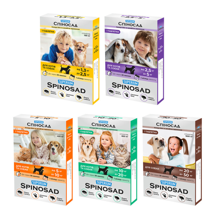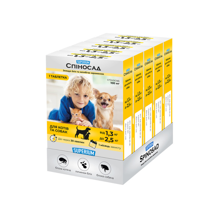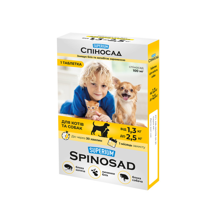 SUPERIUM Spinosad — це перша таблетка природного походження від бліх для котів та собак. SUPERIUM Spinosad розроблений спеціально для захисту улюбленців протягом усього року. Мало хто замислюється над тим фактом, що майже 95% усіх ектопаразитів (у переважній більшості бліх) знаходяться на вулиці. У під'їзди багатоповерхівок вони потрапляють з підвалу. А до житлового приміщення їх частіше за все приносять люди за допомогою взуття та одягу. Тут паразити й знаходять свою жертву — чотирилапого улюбленця, якому навіть не довелося виходити на прогулянку. Ектопаразити небезпечні для тварин і людей тим, що переносять різноманітні хвороби. Щоб запобігти подальшому їх розповсюдженню, необхідно забезпечити улюбленця постійним захистом на цілий рік. Таблетки SUPERIUM Spinosad допоможуть власникам домашніх тварин успішно впоратися з цією проблемою! Діюча речовина (Спіносад) завдяки своєму природному походженню не має побічних ефектів (при правильному дозуванні), що дозволяє використовувати таблетку для захисту найменших улюбленців — котів і цуценят. Спіносад є 100% натуральним (видобувається з бактерій Saccharopolyspora spinosa), на відміну від хімічно синтезованих препаратів. SUPERIUM Spinosad не викликає звикання та адаптації до діючої речовини у паразитів. Таблетка діє на бліх та їх личинок, волосоїдів, а також більш ніж на 20 різновидностей інших ектопаразитів. SUPERIUM Spinosad приймається разом з їжею та починає діяти вже через 30 хвилин. Завдяки сорбентам у складі таблетки, препарат швидко виводить токсини паразитів з організму та вирішує найголовніші проблеми — прибирає свербіння, а також лікує дерматит та рани від укусів. Діюча речовина швидко виводиться з організму тварини та затримується у сальних залозах протягом 30 діб, де діє на бліх та інших ектопаразитів, які знаходяться зовні на улюбленці.