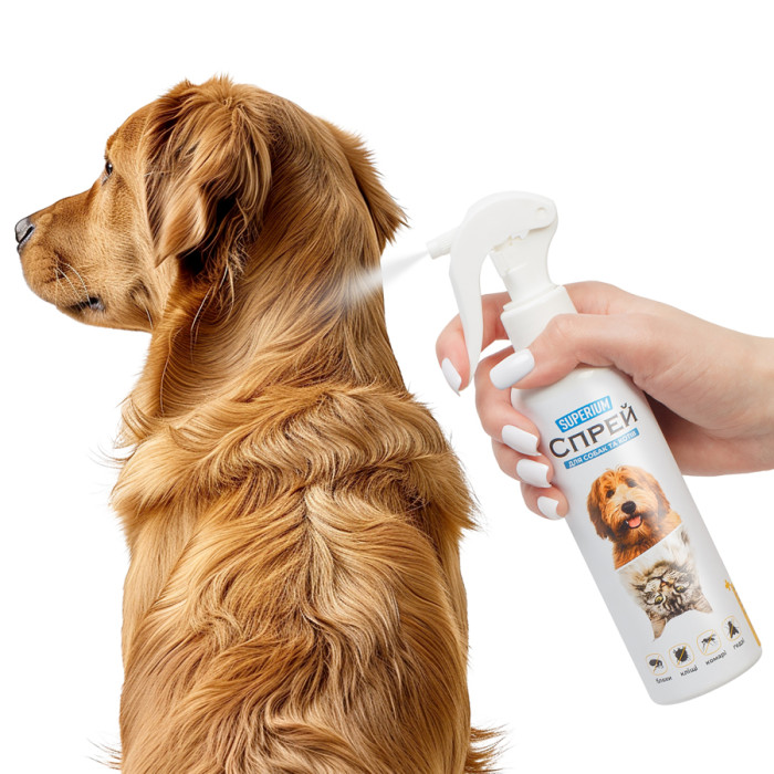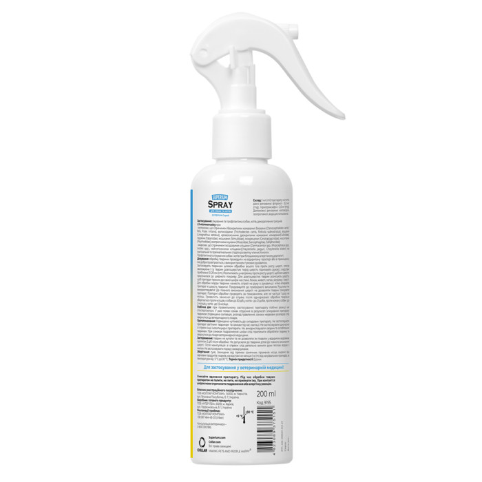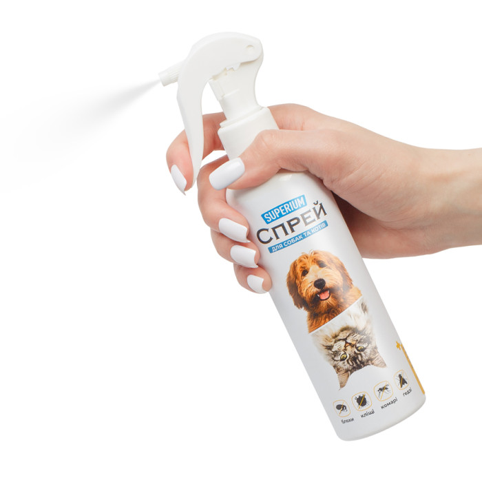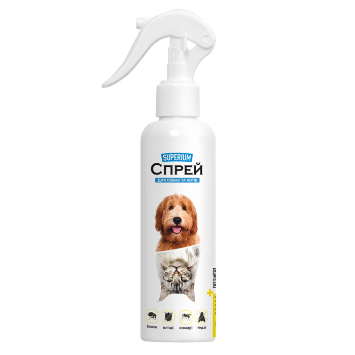 SUPERIUM Спрей призначений для лікування та профілактики при ураженні всіма видами ектопаразитів (кліщами, блохами, вошами, волосоїдами) та комахами (комарами, мухами, мошками, ґедзями), а також для лікування та профілактики блошиного алергічного дерматиту. Склад (1 мл препарату містить): фіпроніл – 3,0 мг, пірипроксифен – 2,0 мг. Підходить для обробки місць відпочинку тварин, підстилок, лежанок, будиночків з метою більш ефективного знищення паразитів та запобігання повторних заражень. Застосовують зовнішньо шляхом розпилення на шерсть та тіло тварини. Особливо важливо використання спрею в період активності кровосисних комах. Починає діяти одразу після нанесення. Обробку тварини проводити на відкритому просторі або в добре провітрюваному приміщенні з використанням гумових рукавичок. Обробка тварини займає всього декілька хвилин. Безпечний для використання котам, собакам та декоративним гризунам з 3-місячного віку. - Знищує та захищає від усіх видів ектопаразитів, в тому числі ІКСОДОВОГО кліща - Відлякування комах - комарів, мошок, москітів та ін. - Профілактика та лікування блошиного дерматиту.