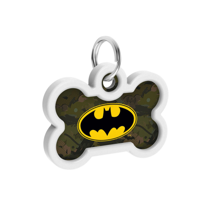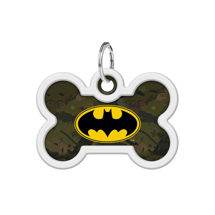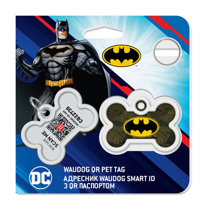 Адресник для собак і котів металевий WAUDOG Smart ID з QR паспортом, малюнок "Бетмен зелений", кістка, Д 40 мм, Ш 28 мм
